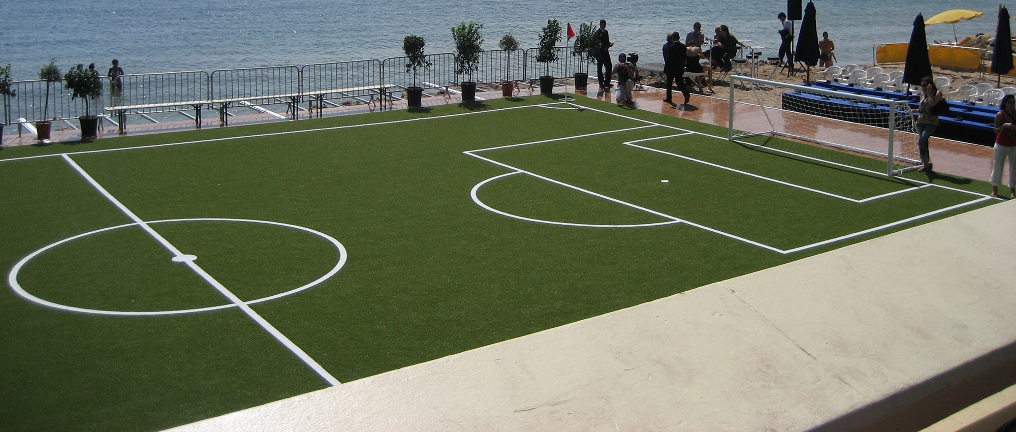Before we could start, a cantilevered stage was assembled on the beach with half the pitch hanging over the sea. The grass was then simply rolled out and fixed around the perimeters.