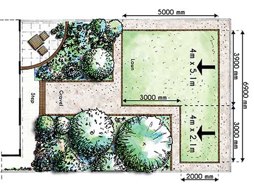 With L-shaped lawns, you should split the lawn into two sections. Multiply the width by the length of one section, the width and length of the second section, and add these together to generate the total square metres required.